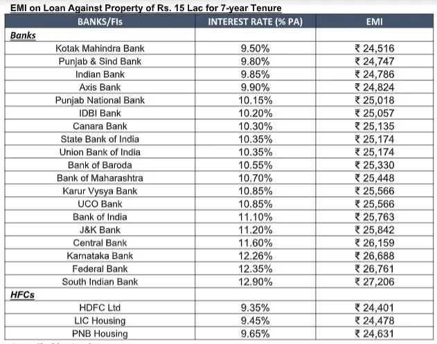 Note: Interest rate on Loan Against Residential Property (LAP) for all listed (BSE) Public & Pvt Banks considered for data compilation (excluding small finance banks) and including selective HFCs; Banks for which data is not available on their website, are not considered. Data collected from respective bank’s website as on 03 Jan 2022. Banks and HFCs are listed in ascending order in their respective category on the basis of interest rate i.e., bank offering lowest interest rate on LAP is placed at top and highest at the bottom. Lowest interest rate offered by the bank and HFCs on LAP is shown in the table (irrespective of loan amount and tenure). EMI is calculated on the basis of Interest rate mentioned in the table for Rs 15 Lakh Loan with a tenure of 7 years (processing and other charges are assumed to be zero for EMI calculation); Interest mentioned in the table is indicative and it may vary depending on bank’s T&C.